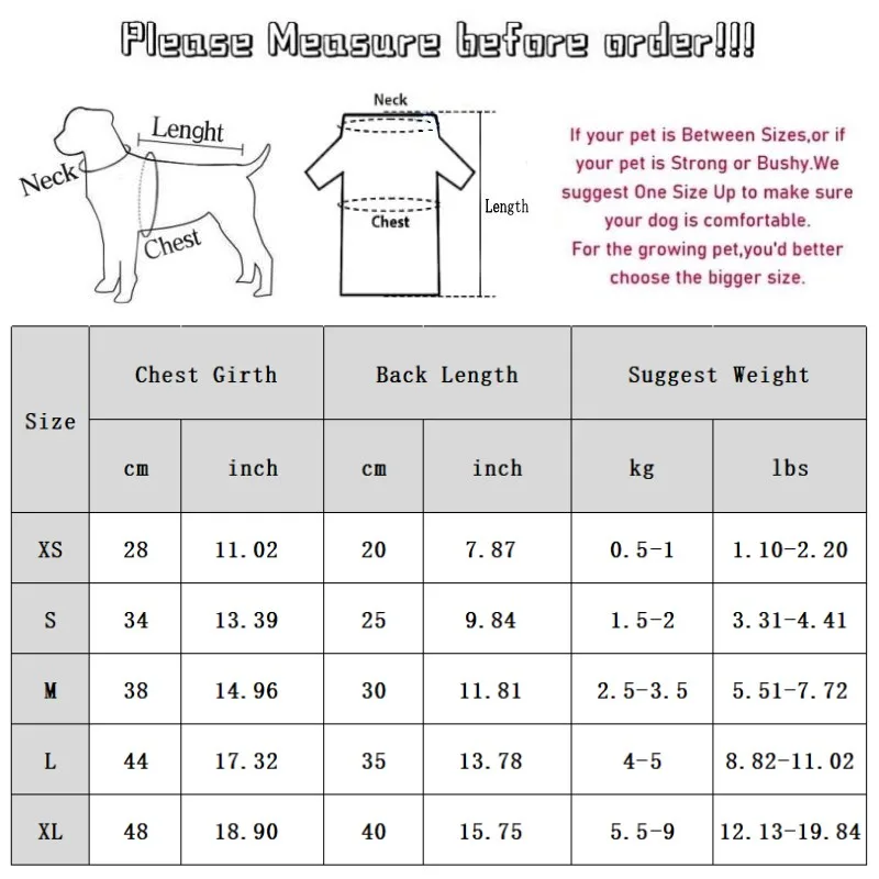 XS: Chest 28cm/11.02'' ; Length 20cm/7.87'' ; Suggest Weight 0.5-1 kg/1.10-2.20 lbs.